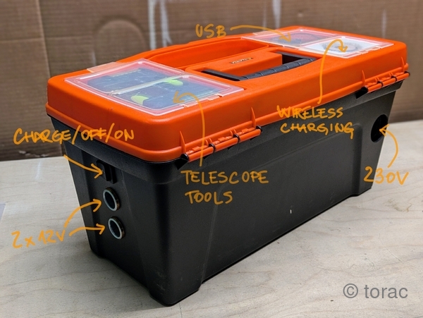 Powerbank is made from surplus plastic toolbox and old car battery. Battery was not suitable for a car anymore, since it’s starting current dropped over time and became to weak to reliably start a car in winter months. But it still has plenty of capacity to power my telescope tracking mount, DSLR and laptop for several nights of shooting. It’s also really handy for off-the-grid camping to keep phones and other gadgets charged without emptying your original car battery.